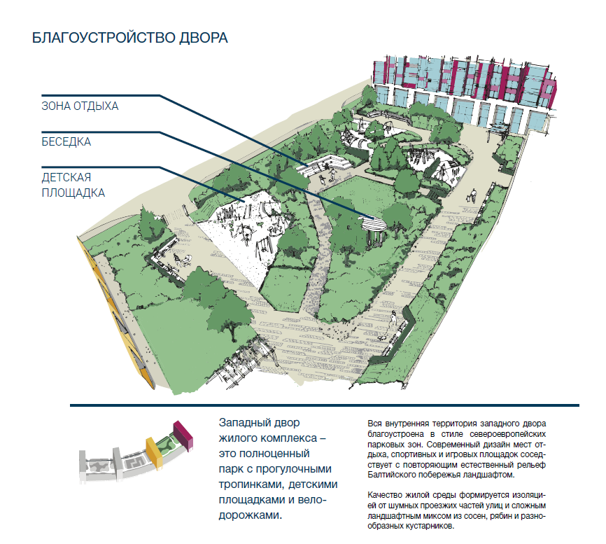 Вся прилегающая территория застраивается по заранее утвержденному плану, включающему в себя создание живописных парков и сети изящных каналов, а близость к Финскому заливу, «зеленым» рекреационным пространствам и выезду на Петергоф делают локацию достойной статуса «Нового Приморского района».