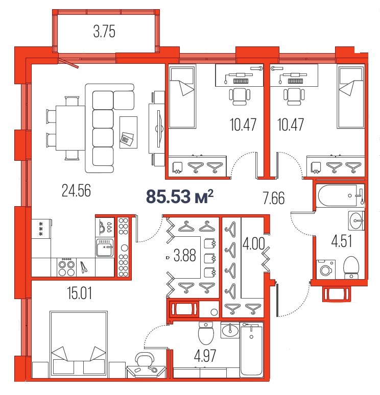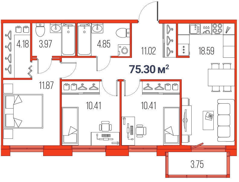 4Евро 75,3 м2